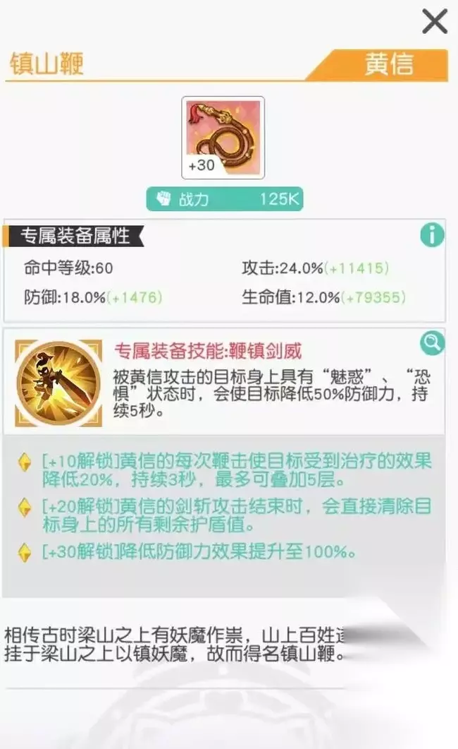 +10:黄信的每次鞭击使目标受到治疗的效果降低20%,持续3秒,最多可叠加5层。 我们可以理解为黄信鞭击进攻的被动,每次鞭击都会降低目标的治疗效果,叠加满可以降低100%的治疗效果,此技能够有效降低敌方阮小二、郁保四、朱武、神火将、老头等治疗效果。 +20:黄信剑斩攻击结束时,会直接清除目标身上的所有剩余护盾值。 如果说+10专属是黄信鞭击的被动,那么+20专属是黄信斩击的被动。+20的黄信对敌方实行斩击时,能够对一击击破敌方任何护盾(霸体等特殊情况除外),无论是物理护盾、还是魔法护盾,都可以被黄信击破,通俗的讲,类似于史进、杨志、阮小二等英雄的护盾都可以被黄信斩击击破。实战中黄信斩击使用的频率更为频繁,怒气技能“开山斩”、小技能“严刑峻法”都能触发+20效果,且“开山斩”释放后斩击时间较长,所以黄信+20还是很有必要的。 值得一提的是,黄信是目前英雄里边唯一可以通过平A一击击破敌方护盾的英雄,这也是黄信这个英雄的精华所在。 +30:被黄信攻击的目标上具有“魅惑”、“恐惧”状态时,会使目标降低100%防御力。 +30是专属技能的最终强化,降低目标防御力从50%提升至100%,在有潘金莲等英雄时,作用就会被成倍放大。应该说是一个中规中矩的+30技能,与+10,特别是+20相比略有逊色。 总的来说,黄信的专武和自己本身特点结合的非常紧密,日哥感觉到设计师哥哥也费了良苦用心,是一个很有特点、针对性非常强的专属技能。日哥由衷说一句,该专属技能,还是非常实用的。 日哥认为,一个好的专武技能,不仅仅是该技能多么优秀、多么强大,而在于这个专属技能与英雄本身特点结合的紧密程度。而黄信这位英雄的专属技能,包括小技能、怒气技能都是环环相扣、紧密联系,让日哥眼前一亮,这个才是完美的专属技能! 4、核心、神器、副将 一、核心 阶段一