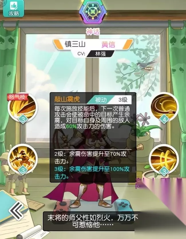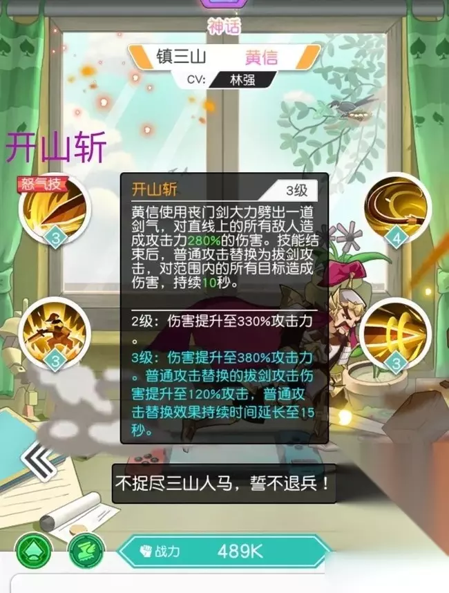 我们解读一下:技能敲山震虎满级后,黄信每次释放技能,下一次普通攻击会使目标自身和周围敌人造成100%的攻击力伤害。 在实战中发现,黄信的攻击释放一般为(开局有怒气、受控制等外在因素除外):上场——平A(以下简称A)—鞭鸾笞凤(4秒)——A——严刑峻法(8秒)——A——鞭鸾笞凤(13秒)——A——怒气技能(16秒)——严刑峻法(20秒)——A.......可以说黄信自身技能的使用率是非常高的,且技能与平A衔接非常合理,在未受控制的情况下,此技能是能够被平凡出发的。总体来说,此技能自身伤害性欠佳,但因为黄信的技能与平A能够有效的衔接,所以技能敲山震虎可以最大化的打出伤害。 四、怒气技能——开山斩