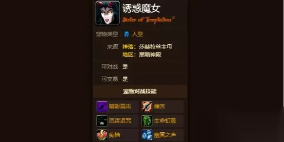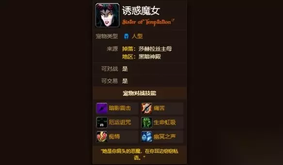 《魔兽世界》诱惑魔女宠物获得方法介绍 诱惑魔女是魔兽世界之中的一只宠物,那么这个宠物要怎么获得呢?其实非常的简单,我们需要击败黑暗神殿的七王莎赫拉丝主母,随后就会有一定的概率获得诱惑魔女这个宠物,详细的内容可以在这里进行了解,一起来看看吧。