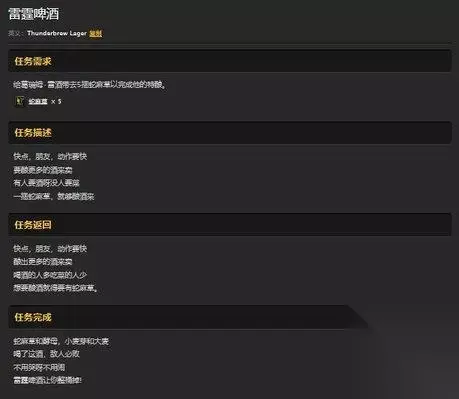 雷霆啤酒介绍: 雷霆啤酒在玩家完成任务【雷霆啤酒】之后获得。 一桶雷霆啤酒可以饮用5次。 饮用雷霆啤酒之后可以提高3点耐力,并且酩酊大醉。