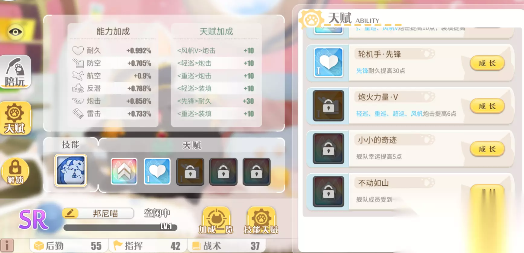 邦尼喵能力值这部分有着较高的后勤属性,也就是在耐久、炮击、航空这一块加成较多。固定天赋、战旗重扬、小小的奇迹、炮火覆盖V、轮机长·先锋。不动是全员减伤3%,战旗重扬是轻巡重巡风帆炮击加10装填加10,小小奇迹是舰队幸运加5,炮火覆盖是轻巡重巡超巡风帆炮击加,轮机长·先锋是先锋耐久加60点。