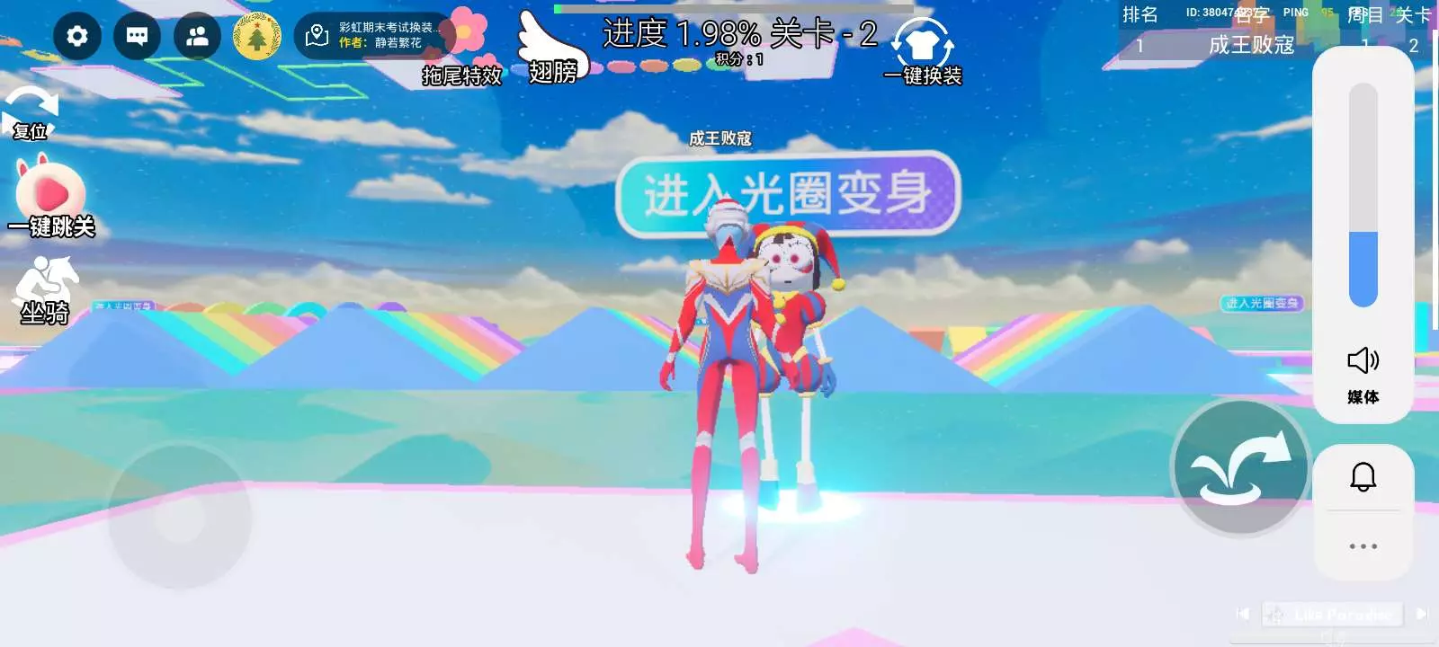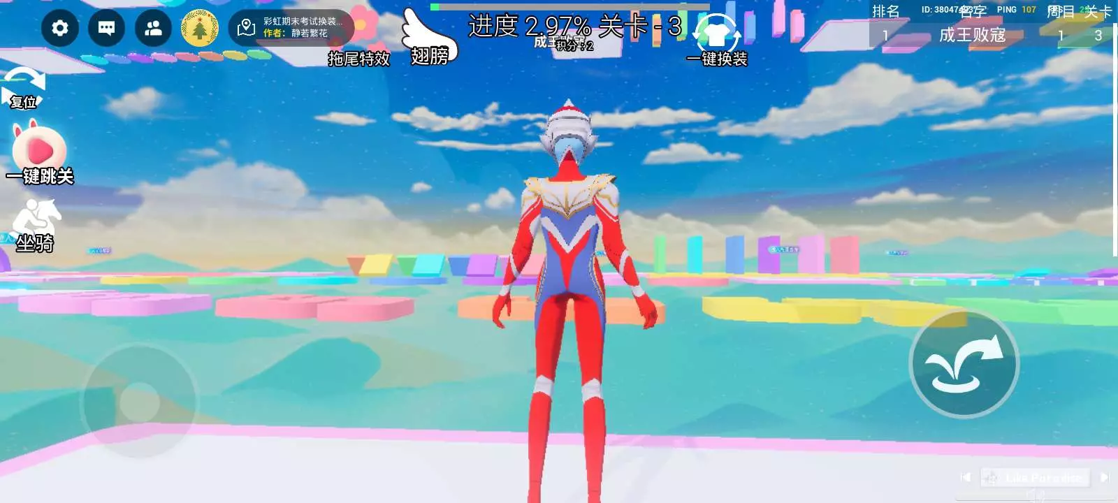 这款奥特曼跑酷小技巧分享!第二关先踩“进入光圈变身”的区域,变身后再冲赛道会更轻松;第三关的彩色方块赛道要注意落点,别踩空掉下去,不然得重新跑进度~亲测变身是通关关键,没变身的话跳台很容易失误,大家可以试试这个方法!