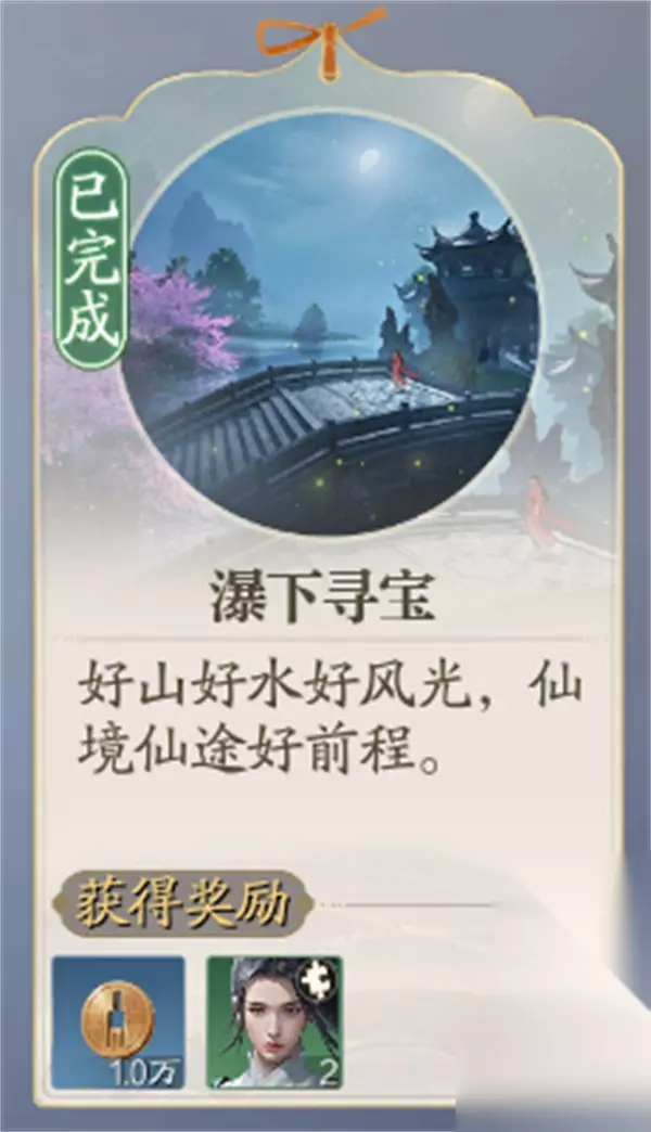 下到水中,保持漂浮状态仔细观察,一看到水中有一处青铜绿色的宝箱,靠近后直接F键就可以打开获得其中的宝箱,同时在奇遇栏目中也会看到这个奇遇显示已完成,并且可以得到1万铜币和2个角色碎片作为奖励。