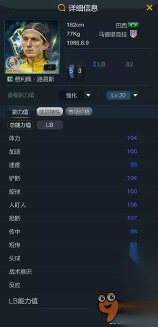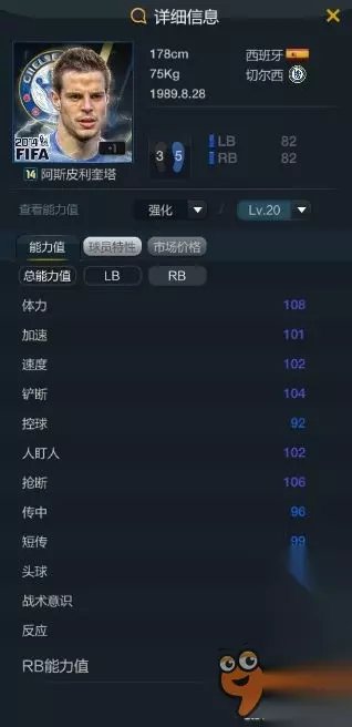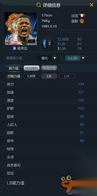 10U埃弗拉 又是个小模型球员,但是lb应该是最不吃身高的,玩朋友的曼联套用着很不错。边后卫最吃的数据是双速,据说这厮高强后就是左脚的小卡福。除了数据方面,花式是4星,虽然个人觉得边后卫3星会马赛就足够了,不过阵地战插上,尤其是对面摆超级大巴了,4星有更多的进攻处理球方式,也许有奇效。但是身高矮确实是硬伤。
