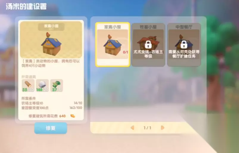接了尤尤的任务后,她通常会让你去找另一位NPC汤米,汤米那里有建筑商店。你需要找到汤米并跟他对话,进入他的商店,在家禽小屋或者畜牧小屋(不同攻略说法可能略有不同,但建筑性质一样)的选项那里,选择修复。修复需要消耗640个摩尔币,这个钱不算太多,平时卖卖农作物和钓鱼就能攒下来。点下修复之后,就需要耐心等待现实时间24小时,也就是整整一天,等修复完成牧场功能就正式为你开放了。