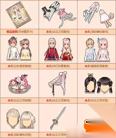 可抽取奖励:月夜精灵卡、仙云之顶服饰(永久)、浅粉券秋服饰(永久)、立秋麦笙套装(永久)、花灯初夏套装(永久)、董扇轻语套装(永久)、仙云之顶戒指(永久)、仙云之顶背饰(永久)、仙云之顶发型(永久)、浅粉券秋发型(永久)、仙云之顶利剑(永久)、风灵疾电右手环