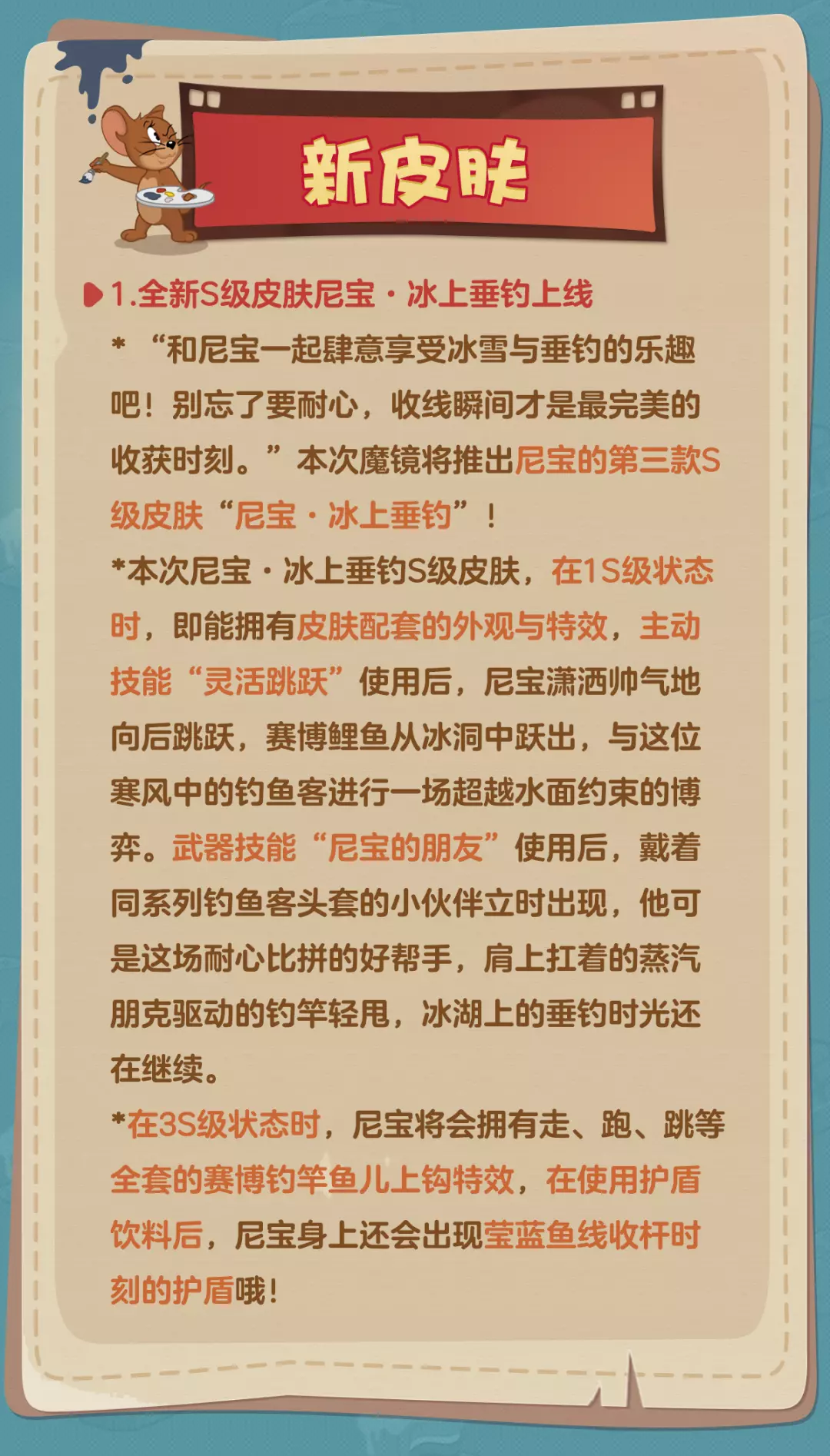 *本次更新后,即将上线全新S级皮肤尼宝·冰上垂钓~您可通过魔镜获得该皮肤。