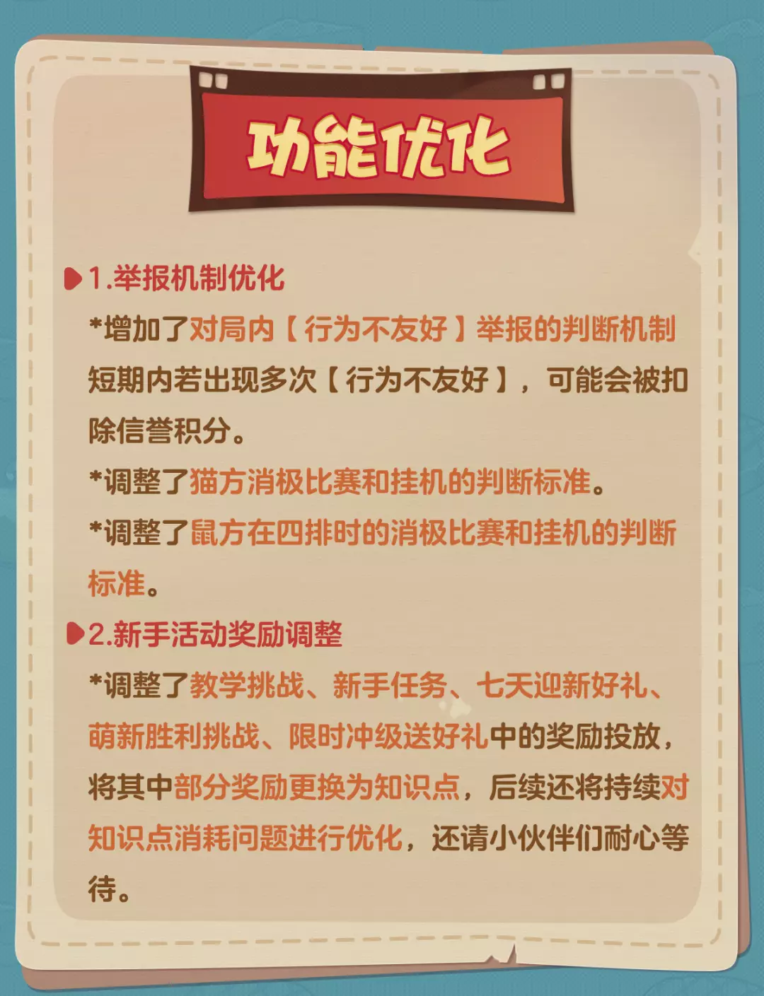 *调整了教学挑战、新手任务、七天迎新好礼、萌新胜利挑战、限时冲级送好礼中的奖励投放,将其中部分奖励更换为知识点,后续还将持续对知识点消耗问题进行优化,还请小伙伴们耐心等待。