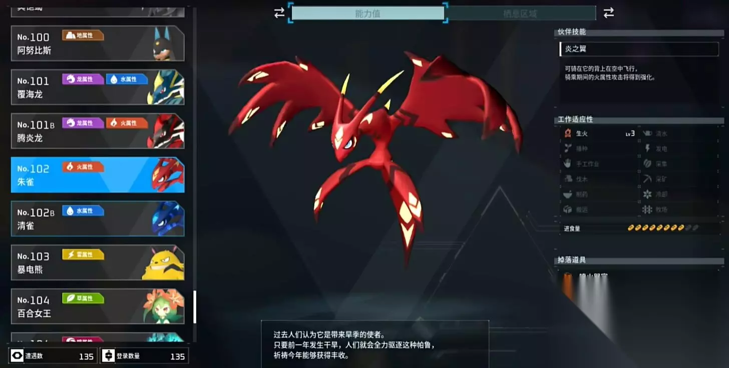 3、朱雀 工作适应性:生火3 解析:仅仅拥有生火3的工作适应性,可以专注与进行生火,帮助你更好的完成各种类型的烧制工作。
