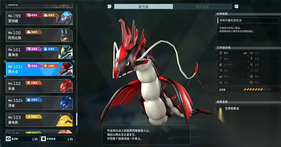 2、腾焰龙 工作适应性:生火4 解析:提供了4级的生火,可以让你轻松的烧制各种类型的火焰,功能非常的全面,是最强的生火的帕鲁。