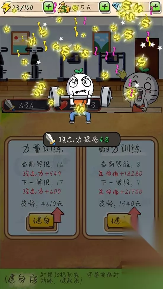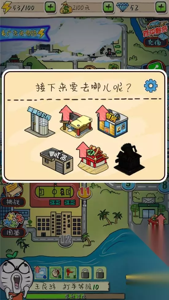 二、“虐”老王 :功能房里助老王修身养性 小伙伴们在游戏中,根据提示,即可发现城市中的恶霸现象,并及时“抢单”,呼唤英雄王尼玛上场!此时的王尼玛身披战袍,是英勇的,面对各种boss也是勇猛的!但,如果小伙伴们不及时给王尼玛加buff,你会看到被打爆的王尼玛,表情很赞值得收藏!如果你不想看到王尼玛被揍,那么点击功能,可以选择健身房,看王尼玛疯跑以及举哑铃,来提升自己的攻击力与生命力!当然,除了健身房,还有禅院、武馆、酒吧等场所,都能为王尼玛的成长做出重要贡献!在这里,有打瞌睡的王尼玛,有醉生梦死的王尼玛,还有武痴王尼玛……喜欢王尼玛的玩家,千万不要错过如此“虐待”老王,助其减肥的机会哟!