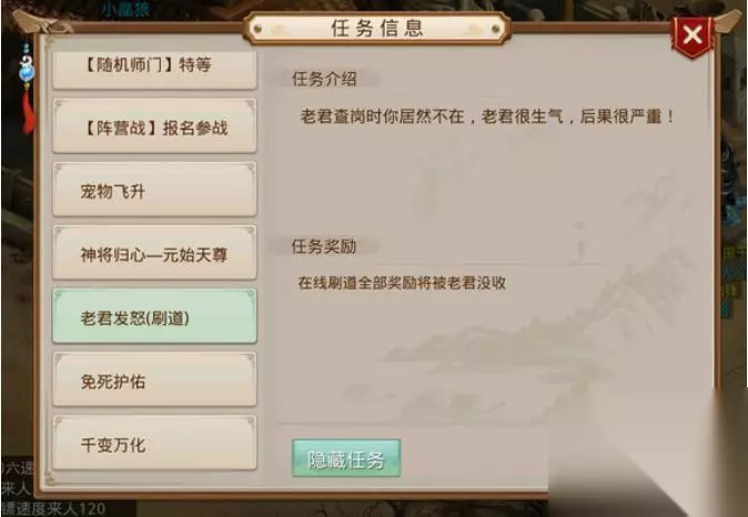 问道如何避免老君查岗 老君查岗介绍: 1、老君查岗就是说在你自动的时候会出现查岗,让你回答问题。如果没在规定时间内回答正确,则就判定为不在,就会受到相应的惩罚,或没收经验道行或者金钱奖励。