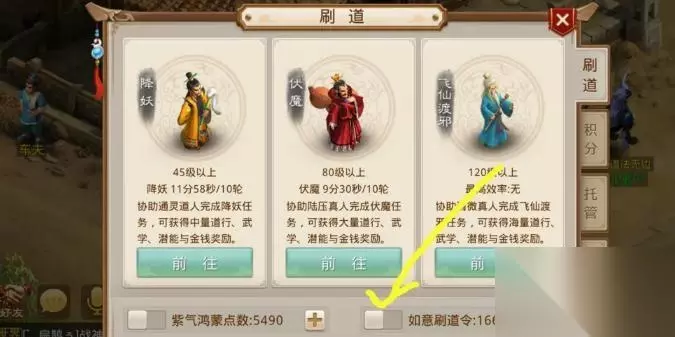 2、除此之外,我们还可以花费托管来摆脱老君查岗,我们点击刷道以后,点击托管,会进入托管界面。