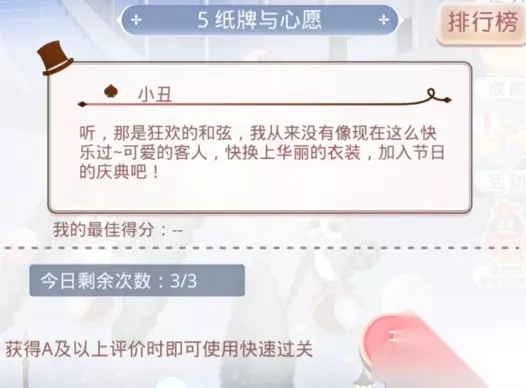 魔力庆典活动攻略魔力马戏团 神秘的思麦尔 纸牌与心愿 关卡答案 活动说明: 1、本次活动时间:3月30日更新后—4月5日23:59,共7天。 2、活动一共有5关挑战,考验分为问答类与搭配类,每关每天有3次免费挑战的机会。 3、问答类考验只要答对即可获得5个魔力纸牌; 4、搭配类考验,评级越高获得的奖励越多。S得5个纸牌,A得3个纸牌,B得2个纸牌,C得1个纸牌。分数只要达到S就够了。 5、挑战失败(问答回答错误、搭配获得F)不会扣除挑战次数 6、每30钻可重置关卡,重置次数无上限