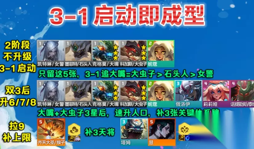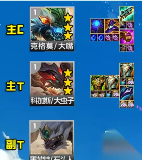 2、主T装备 主T科加斯:两个方案,狂徒+双板甲,狂徒+板甲+龙牙,个人感觉AOE的法伤还是多,救赎基本放弃,大嘴本身就刚需2个水滴,不够分副T墨菲特:离子溢出散件:妮蔻享受通用肉装、莉莉娅享受通用法伤装 四、运营思路 2阶段:不主动升级是,只留体系的5张牌,尽量换怪 3-1启动开搜:关键搜大嘴、科加斯,然后是墨菲特,最后是女警,如果出现卡牌情况,女警先放弃,一旦大嘴和科加斯到3,就停手 大嘴科加斯双3后:升6/7/8级,补出俄洛伊、莉莉娅、诺提勒斯3张关键牌,阵容即可大成后续补上限:看转职决定