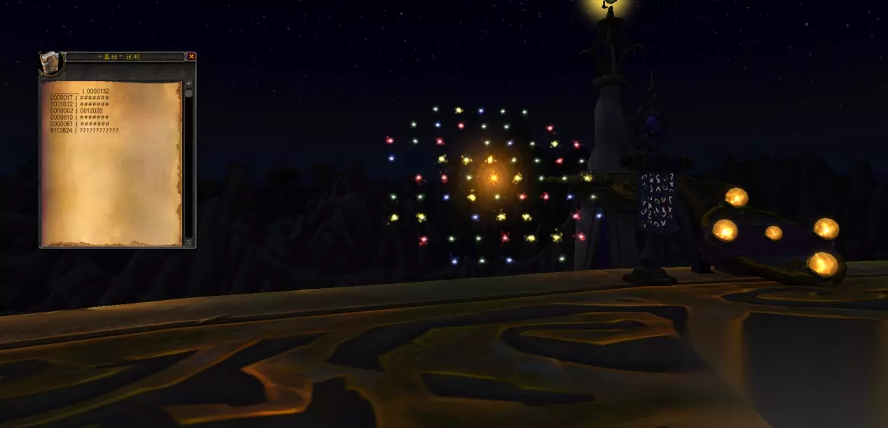 绿色线是一个羽毛,玩家们也很机智的想到了阿兰卡锋林地图上的副本通天峰,在通天峰中在佩戴了"正牌寻宝护符"后在副本中尾王处发现了有可以点击的说明和宝珠装置,说明内是一串二进制数据,点击宝珠后会出现如此的场景,左边的是一串二进制数据说明,右边外围四个按钮可以控制中心亮的东西上下左右移动,中间的原点则是重新玩一次,其中有蓝、黄、绿、红光点,也正好符合了这次解密的任务线,如何解密就交给各位头脑大神吧,我在玩了这个游戏后获得了一个叫漆黑如墨的BUFF,你所到之处都是漆黑一片,我回到主城时,问别人天黑了吗?他回答我说天亮了.....。