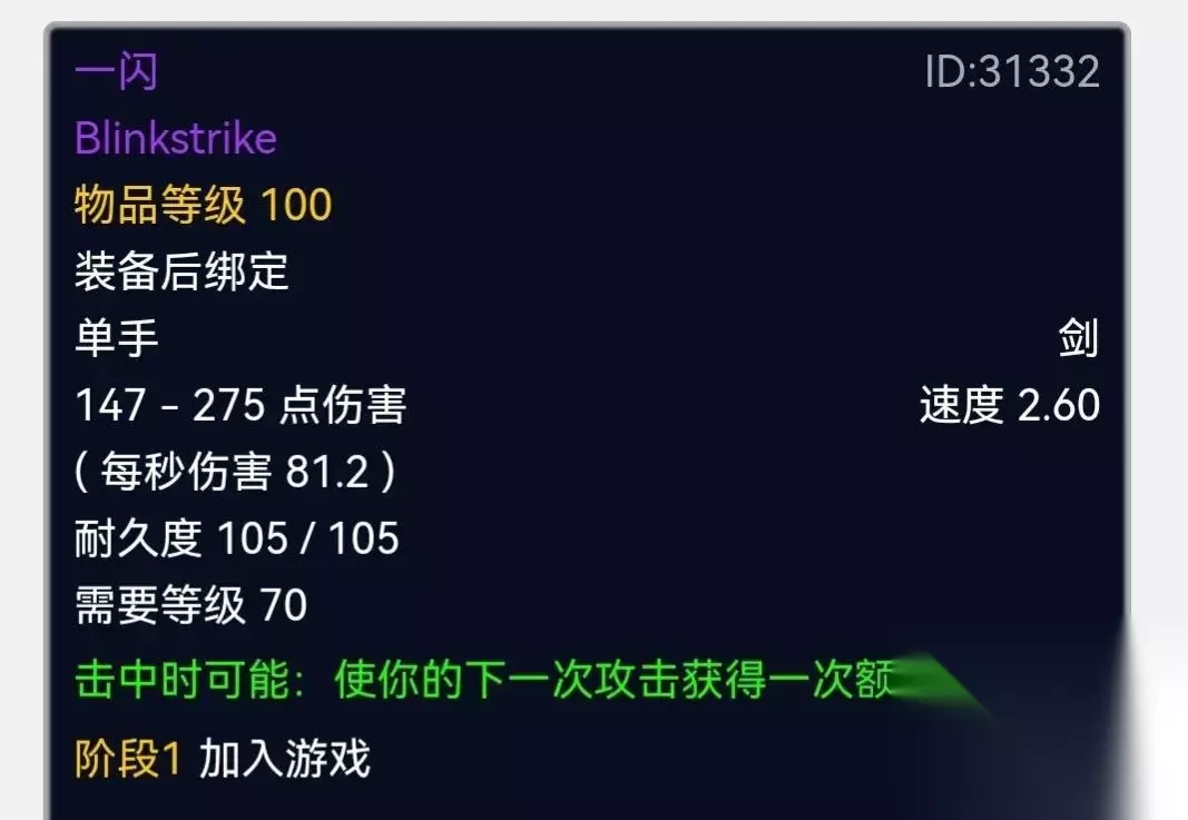 伊利丹 整个TBC期间,法师和术士都出尽风头,盗贼和狂暴战这些近战职业虽然大幅削弱,但尚能一战。 我们挑战了凯尔萨斯的风暴要塞,瓦斯琪的毒蛇神殿,还有伊利丹的黑暗神殿,基尔加丹的太阳井!也获得了无尽的战利品,其中,剑类武器一直是魔兽世界颜值的代表。 今天我们就来回忆一下,TBC时代最著名的十二大近战单手剑。 一闪 装备绑定,无数战士和盗贼的入门装备,模型很拉风,极具德拉诺科技感!