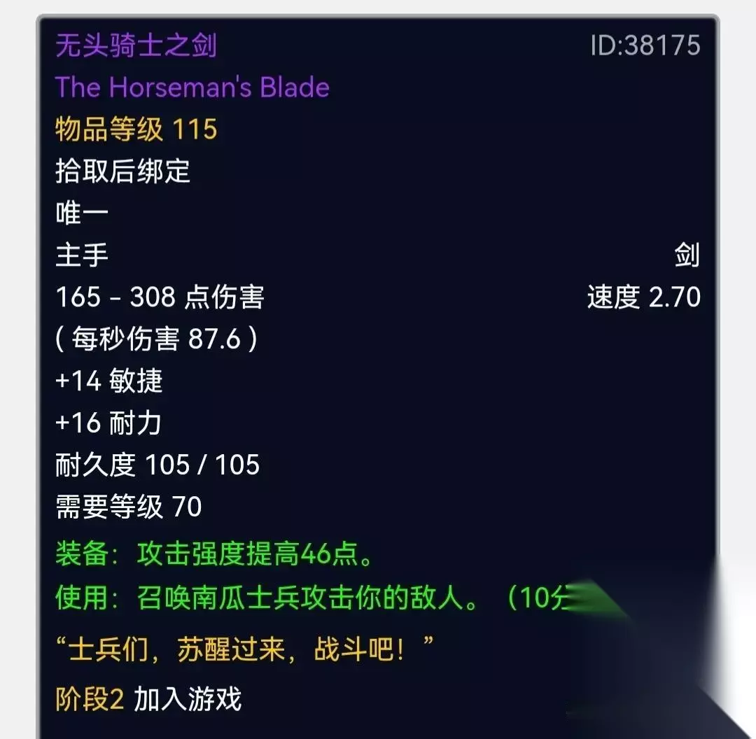 无头骑士之剑 万圣节无头骑士掉落,基本上算是白送的紫色单手剑,也是许多人的起步装备!