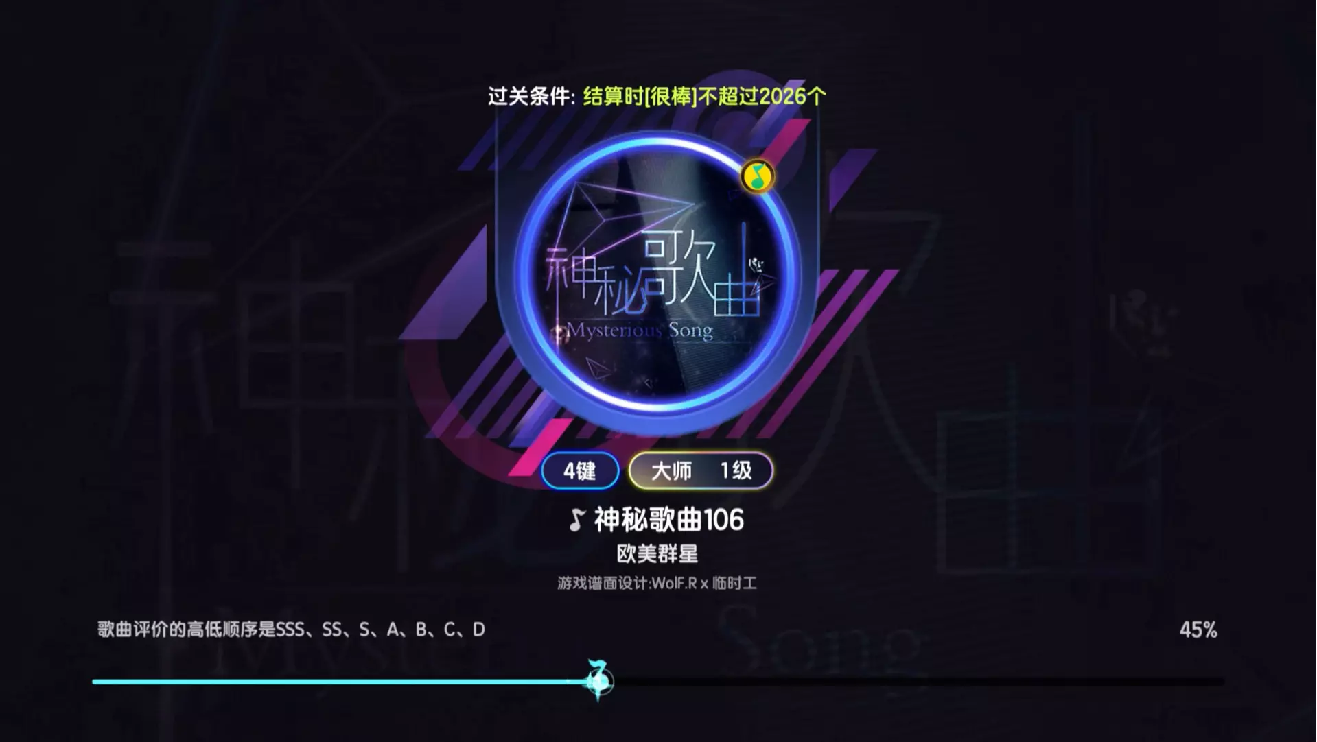 曲目:神秘歌曲106(Through The Fire And Flames)(浴火焚焰) 难度:Lv.1(4键·大师) 谱师:WolF.R/临时工 歌曲所处位…