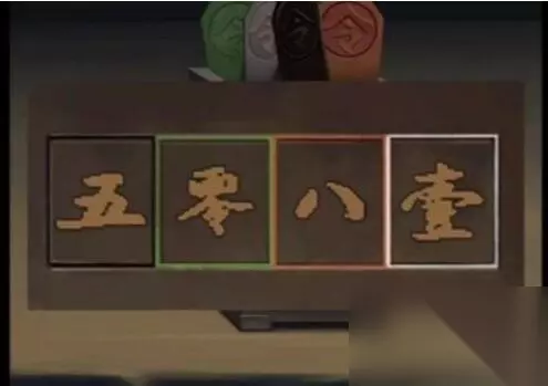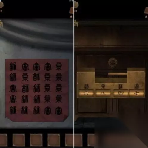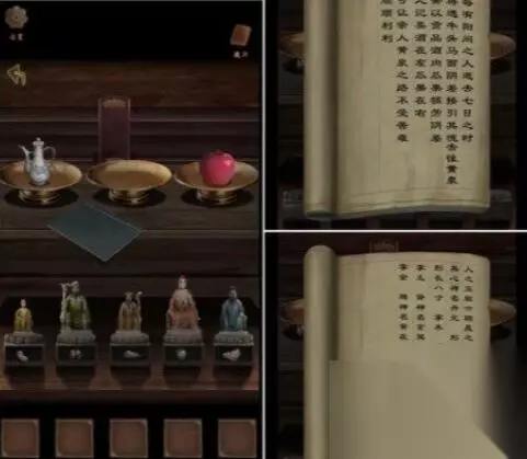 2、从牛头上拿到纸戟。出去击打左边树上的果实,得到紫色石榴果。 3.灵堂内,墙上的红纸上写着一句话。打开柜子上的密码锁,得到空酒瓶和五神娃娃。