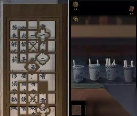 13、桌前放置字画缸数量,屏风后悬挂文字信息。打开窗户得到抽屉拉环,将其安装到左侧书柜抽屉上并拉动以获得密封条。封印,戴上字得到铜钥匙,打开右边的暗室。