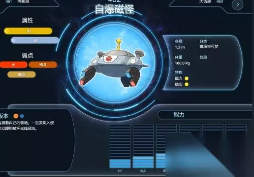 5、自爆磁怪拥有电与钢属性,特性是磁力和结实,自身的防御和特攻值都较高。