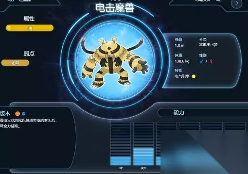 3、电击魔兽拥有电属性,特性是电气引擎,能力值如下图所示,自身的物攻和速度值较高。