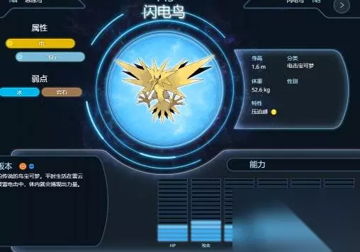 4、闪电鸟拥有电与飞行属性,特性是压迫感,能力值如下图所示,自身的特攻和速度值都比较高。
