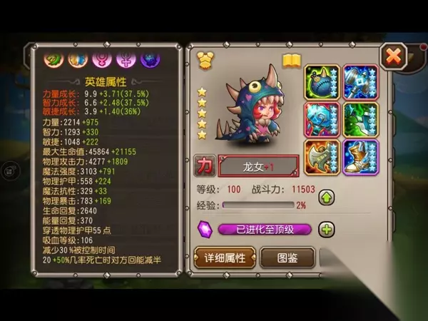 龙女作为前排物理英雄,享有多个输出技能,所以她的穿透物理护甲及不俗的吸血显得更加重要,其次6000+的物攻在前排输出英雄中属于佼佼者。配合大招的提升回血速度可以生存的更久,并且反伤给敌人,是一个越战越勇的萌女战士! 此外,龙女享受以下加成: 1、龙族——享受龙骑士觉醒技能加成,可获得生命值上限提升。 2、变身系——享受流浪剑客觉醒技能加成,可获得提物理攻击力增强。 3、女性——享受军团觉醒技能加成,可获得生命值上限的提升。 4、女武神——享受小黑觉醒技能加成,可获得护甲穿透增强。 5、梦想家——享受龙女觉醒技能加成,可获得魔抗提升。 【技能介绍】 发脾气(大招):龙女发泄自己的愤怒,变身巨龙状态,增加攻击范围和攻击速度并拥有极高的回血速度,同时将受到伤害的60%反弹给伤害她的人。 委屈反击(普通):龙女躲在金色的保护罩中,受到的伤害降低50%且免疫一切控制。期间一旦受到4次伤害,则会进行强力的反击,造成范围物理伤害及晕眩效果。 潜力爆发(普通):龙女爆发自己的潜力,对眼前的敌人进行连续的打击,击飞敌人并造成物理伤害。 暴怒之爪(普通):龙女在巨龙状态时会利用自己的双爪进行普攻,造成更大范围和更多的物理伤害。 【发脾气】