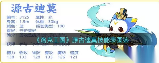 《洛克王国》源古迪莫技能表图鉴 源古迪莫: 1、源古迪莫技能表如下,配招源古水环+圣光漾泉+光影斩杀+破魔圣光箭。 2、源古迪莫性格推荐勇敢。
