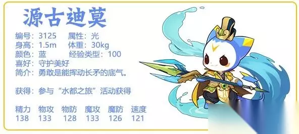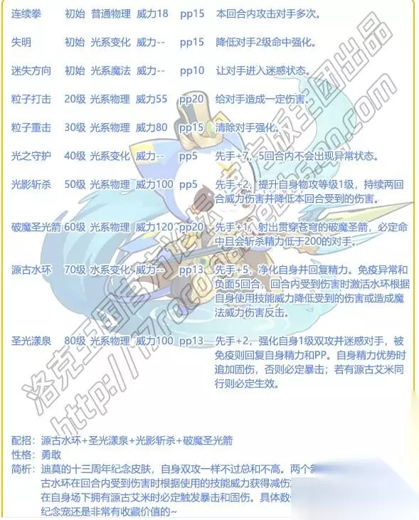 3、迪莫的十三周年纪念皮肤,自身双攻一样不过总和不高。两个新技能都是13pp,源古水环在回合内受到伤害时根据使用的技能威力获得减伤或追加魔法伤害。 4、圣光漾泉在自身场下拥有源古艾米时必定触发暴击和固伤。 5、具体数值有待测试,不过作为周年纪念宠还是非常有收藏价值的。