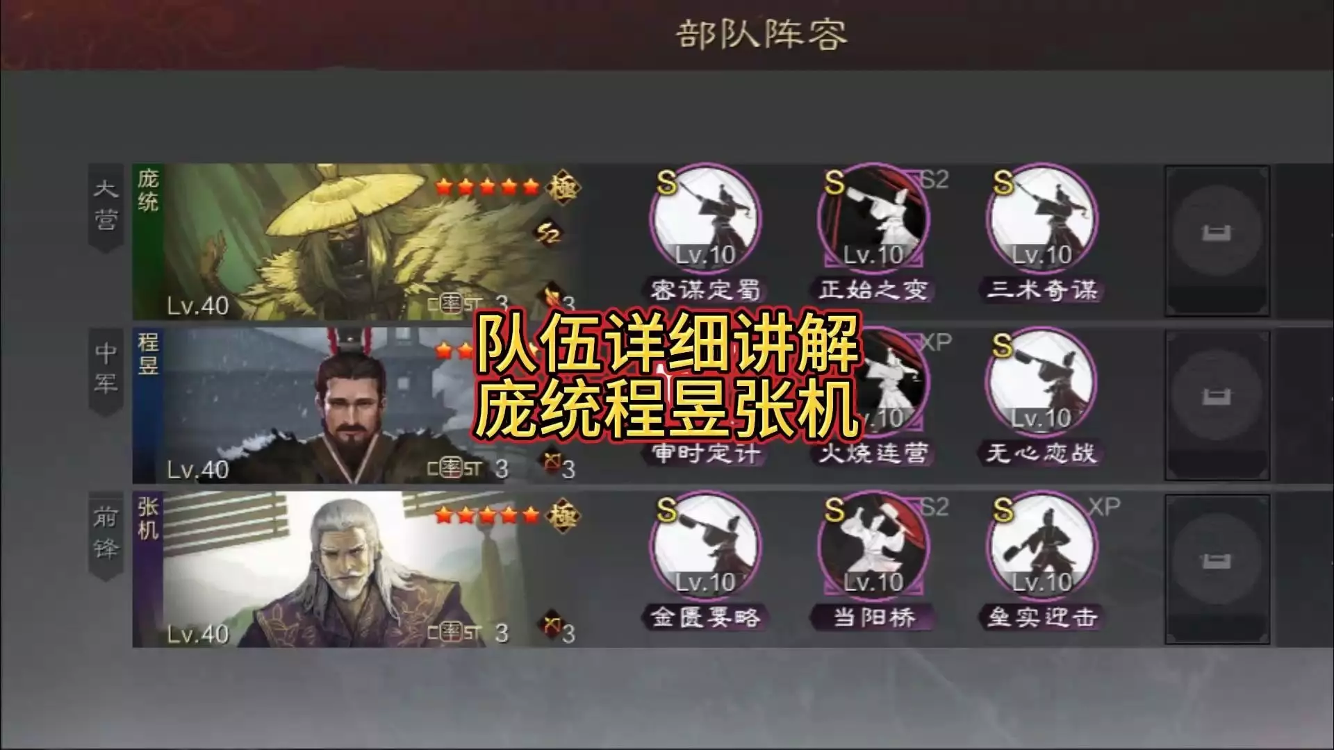 三国志战略版平民诸葛父女枪 (主将)诸葛亮,战法搭配:刮骨疗毒+八门金锁阵 兵书选择——援其必攻+掩虚 (副将)关羽,战法搭配:盛气凌敌+横扫千军 兵书选择——横扫千军+盛气凌敌 (副将)关银屏,战法搭配:据水断桥+青州兵 兵书选择——据水断桥+青州兵 (测试阶段武将和战法等级还没满,2/3技能基本只有6-8级!) 实战对抗战报: 低战损赢下孙权吴骑,基本上盛气凌敌缴械到太史慈和孙权就稳赢了,这也是为什么即便关羽演戏,只用了几百战损就赢下对面的原因。 等级劣势,还吃了克制的情况下,最终优平麒麟弓,庞统被控的死死的。 打甘太程也没太大的问题,有盛气打太史慈队伍赢面就是比较大。 碰撞三势贾也是小胜一波。 总结:讲道理了,父女枪的玩法里,SP诸葛亮的契合度肯定是高于老诸葛的,毕竟关羽和关妹自带战法都可以通过SP诸葛亮更好的得到触发,否则关羽的确很容易出现演戏的问题,关妹战法触发后也更容易打出控制链!当然了,SP诸葛亮并不好抽,如果有的话可以直接安排上,对战胜率会有比较明显的提升,战法方面的话可以保持现状或者根据自己的理解进行微调整,刮骨疗毒可以换婴城坐守整装待发等!
