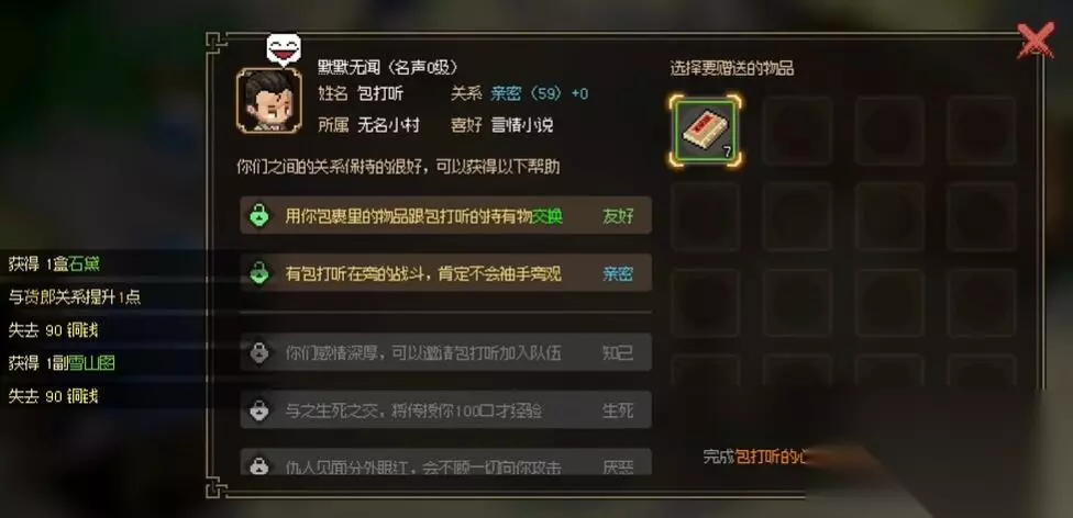 大侠立志传全npc入队攻略大全 大侠立志传包打听怎么入队 答:通过加深好感到亲密,能够加入到队伍中。 喜好:言情小说,每次22点