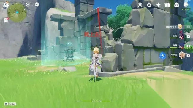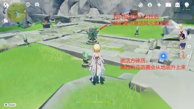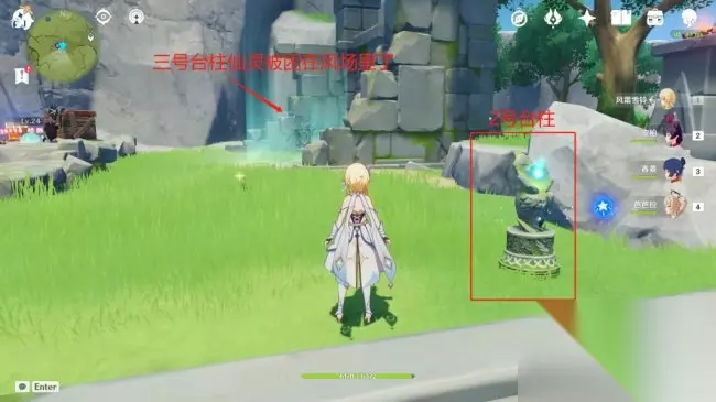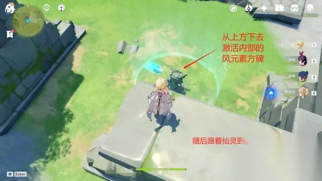 来到上图位置,从上方直接进入风场,并且激活风场内的风元素方碑,即可破处风障,随后仙灵会自己回到3号台柱位置