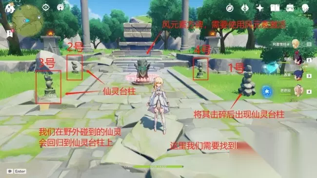 如上图,击败后我们可以看见1个被封印的风元素方碑和旁边的3个仙灵台柱,还有1个仙灵台柱被封在了碎石堆里。一共4个台柱,上图的编号是我们后续文章需要用到的。