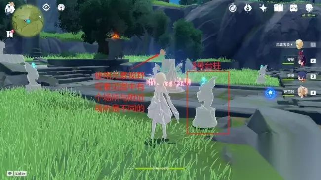 跟随仙灵来到3号台柱位置,点开元素视野,此时,小伙伴们会发现远处有一处地方与场景内的其他地方颜色不一样(元素视野是非常重要的,小伙伴们在探索解谜的时候要多佳运用它)