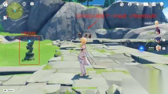 在1号仙灵台柱的右手边,我们可以看见一个仙灵被三个QQ人困住了