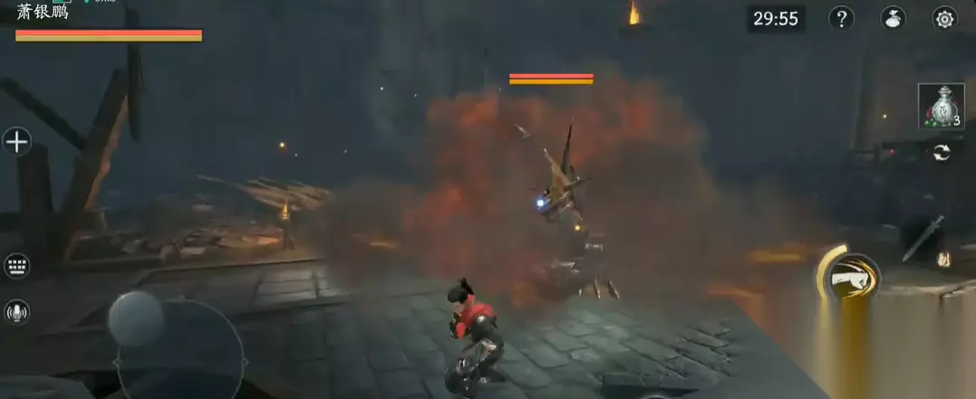 进入第二阶段后,萧银鹏会新增疯狂扫射和毒性炸弹两种威胁更大的技能。疯狂扫射呈扇形范围,横向覆盖极广,采用前后方向闪避相对容易躲开。毒性炸弹会从空中落下,爆炸范围较大,需要保持移动或使用闪避进行规避,且施放该技能后他常会高高跃起砸向玩家,需额外小心。整个战斗过程中,必须严格管理精力,避免因滥用闪避而陷入无法行动的困境,输出时应保持克制,每次攻击2至3次后即准备回避,贯彻不贪刀的原则。