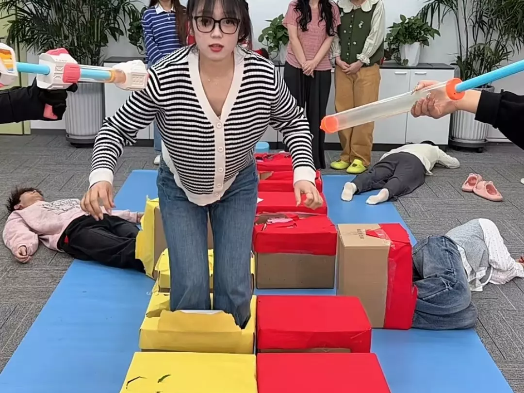 这是一场办公室里的字母扫雷挑战,一群员工参与其中,通过选择字母来进行游戏,选错会触发相应惩罚,现场氛围欢乐,是有趣的办公室团建小游戏。