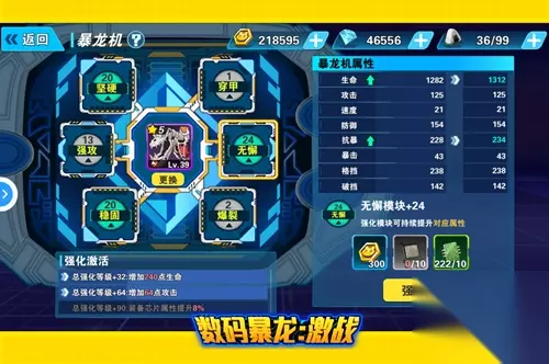 战斗中威力倍增 在数码兽战斗中,科学的合理阵容搭配是制胜的关键,针对数码兽的类型定向培养1-2个模块可以起到事半功倍的效果,有的放矢的提升爱宠能力,最大化发挥每一颗钻石的价值!当然,土豪玩家可以把所有暴龙机属性全部加满,祝各位看官早日养成心目中完美爱宠,打遍天下无敌手! 属性激活还有加成 强到没朋友 暴龙机6个模块需要分别培养,培养过程会消耗金币和模块插件。模块每强化四级需要一次突破,突破时需要提供特定材料,突破后的模块属性提升能力更高。6个模块总强化等级达到指定目标后,可激活额外属性加成,进一步提升数码兽实力。强化插件可以通过资源工厂、冒险岛等活动产出,玩家可以在每天的日常活动中收集,快速培养出强到没朋友的数码兽!