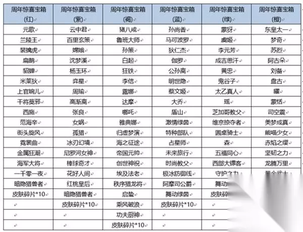 王者荣耀六周年惊喜宝箱奖励有哪些 1、奖励内容一览 惊喜宝箱一共分为六种颜色,每种颜色的宝箱奖励都不同,价值最高的是褐色宝箱