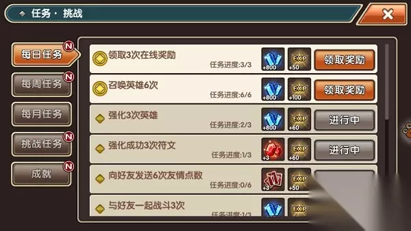 游戏中的符石玩法非常有趣,玩家可以给英雄镶嵌祝福、保护、意志、吸血等15种不同类型的符石,带给英雄不同效果的属性增益。关于符石的选择,建议结合英雄自身特性,譬如冲锋型的牛头人战士,可以选择攻击型符石,最大限度激发其战力。需要提醒的是,符石还拥有套装属性,同类符石达到一定数量,即可激活套装属性,进一步强化英雄实力;所以大家在镶嵌符石时,应尽量选取同类型。 符石的另一个亮点是强化,玩家只需花费日常货币,就可以提升符石品质,品质越高,增益效果越强;而且符石品质每达到一定阶段,还会出现追加的增益效果。强化符石,是我们最重要的日常工作。 英雄合成看技能 游戏中的英雄可以通过合成、进化、觉醒等途径,增强自身战力。英雄进化、觉醒需要满足等级、材料等需求,而合成只需有英雄作为材料即可。合成时,应留意英雄技能,相同技能的英雄合成,可以提升技能等级,加强技能效果。 日常挑战奖励多