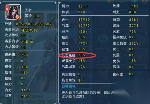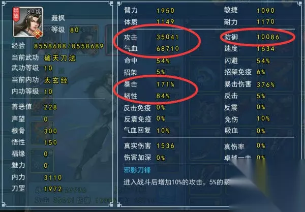 这样进入战斗后实际防御12000+,实际气血82450(经脉加20%气血,20%防御),有84%韧性,还有10%免伤,生存额能力很强,同时还有35000的攻击以及171%暴击率,376%暴击伤害,在减防的配合下爆发能力依然强悍。 按以上属性计算,36000攻击的独孤剑(假设伤害加深=20%)即使触发打3效果,普通伤害也只能打掉上述属性刀26500气血,刀回合结束会回复气血8245,实际当前回合减少气血18000+,相当于总血量的五分之一多一点。而剑打84%韧性的刀打出暴击的几率并不高(华山决赛暴击剑的暴击率会达到120%甚至更高,刀的韧性要求要在90%以上),就算小几率打出了暴击,按300%暴击伤害计算(华山决赛极端剑暴击120%,爆伤330%的基本满爆发属性,则需要增加一些韧性,牺牲一些暴击),也只能打掉这个刀79500气血,不足以形成秒杀,所以生存能力还是不错的。 这种刀现在用的玩家很少,其实高生存的输出刀并不一定比纯暴力输出的刀弱,在现在独孤盛行的时代,可能会更实用。能很好的对抗独孤打后排的伤害。 对抗反震流需要注意调整爆伤值,要降低爆伤直到合理位置可以对抗反震拳。 命中基本上放弃了,遇到闪避拳或者闪避剑基本打不到,解决办法就是把韧性项链换成命中项链,牺牲暴击换取一些命中,但效果依然不理想。 2.关于【剑】职业的几个流派 1) 六脉破防单体攻击流派