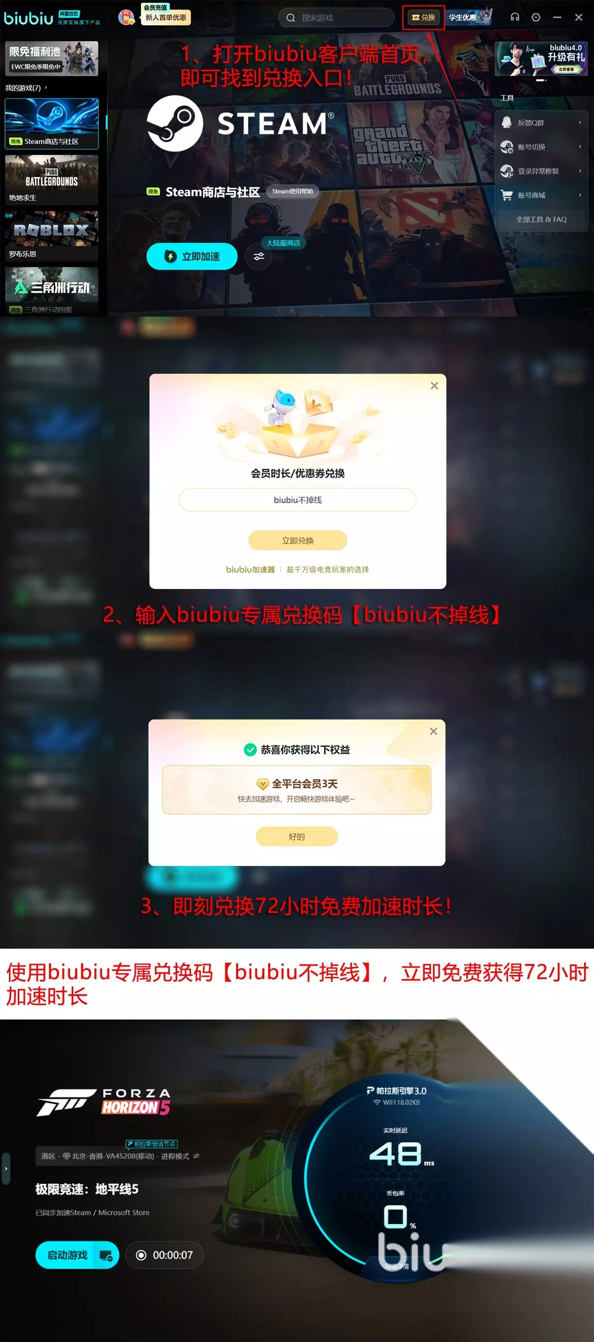 即刻行动可获得多重好处,新用户注册即可享受首日24小时全功能免费试用,输入【biubiu不掉线】额外获得持久流畅运行72小时,双重福利叠加,总共可以畅享96小时顶级加速体验。