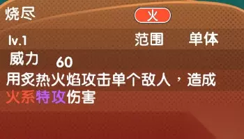 初始技能-烧尽:用炙热火焰攻击单个敌人,造成火系特攻伤害。威力:60 范围:单体
