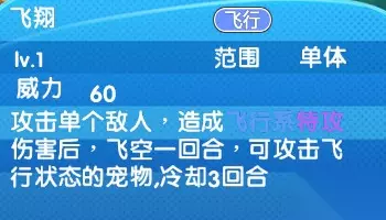 当品质度达到绿+1解锁-飞翔:攻击单个敌人,造成飞行系特攻伤害后,飞空一回合,可攻击飞行状态的宠物,冷却3回合。威力:60 范围:单体