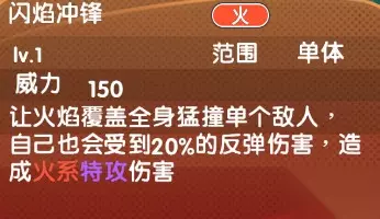 当品质度达到绿解锁-闪焰冲锋:让火焰覆盖全身猛撞单个敌人,自己也会受到20%的反弹伤害,造成火系特攻伤害。威力:150 范围:单体