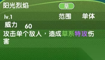 当品质度达到蓝+1解锁-阳光烈焰:攻击单个敌人,造成草系特攻伤害。威力:60 范围:单体