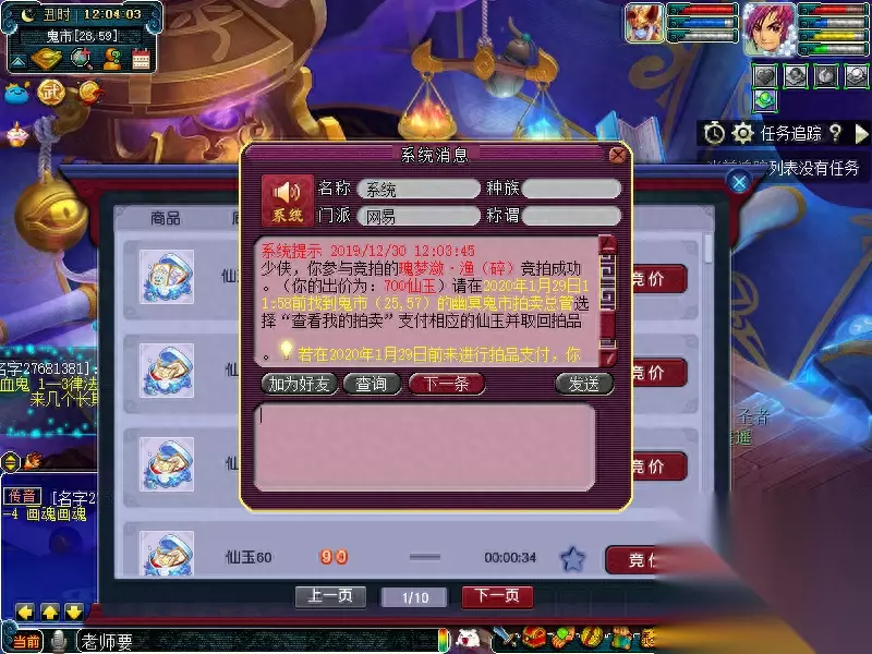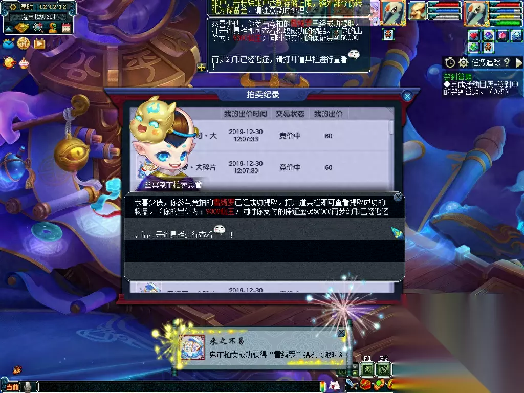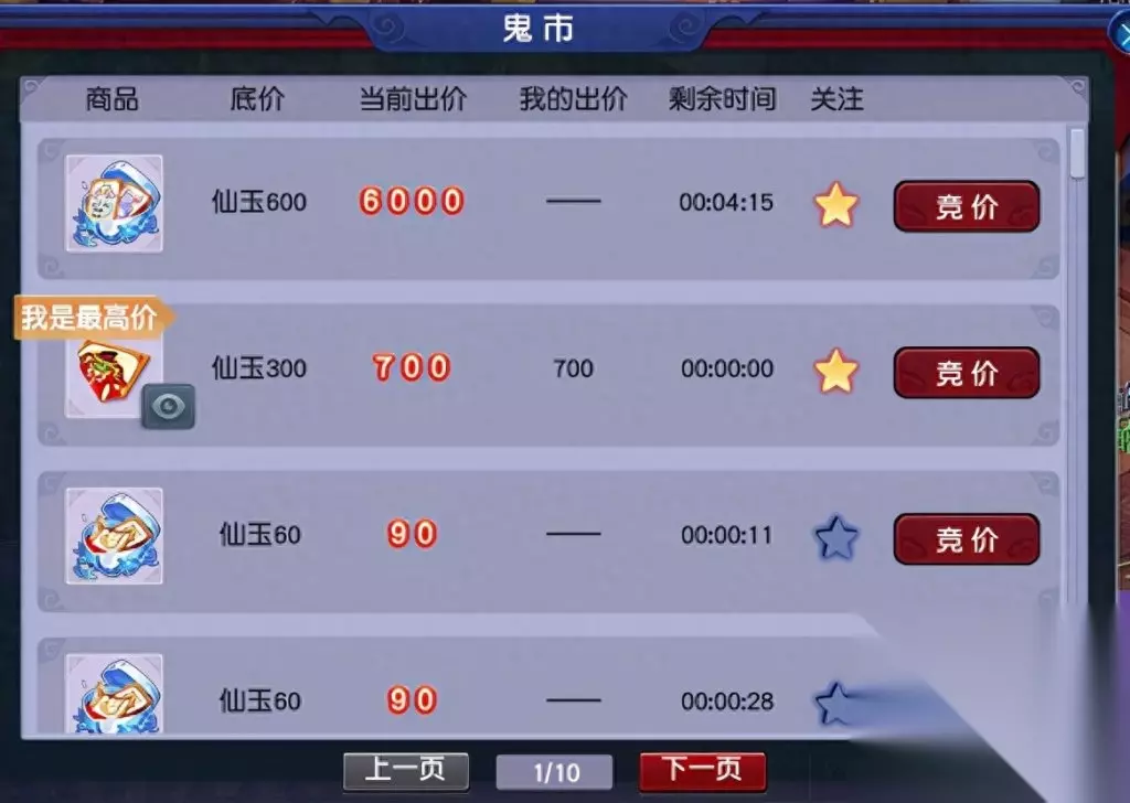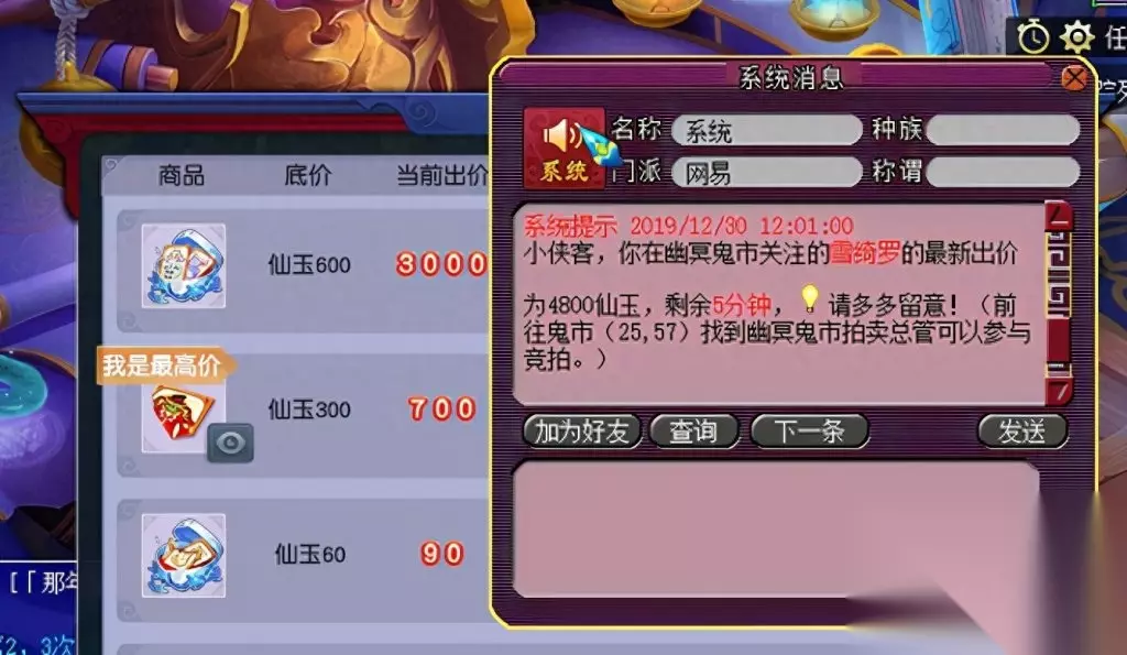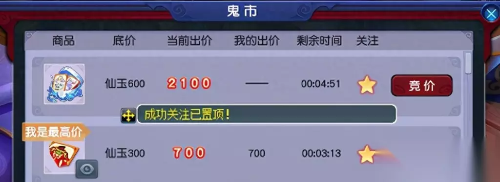 特殊说明: 1、 若拍品拍卖结束前5分钟内无人加价,则拍卖周一12:00结束拍卖,结算胜出者。 2、 若拍品拍卖结束前5分钟内有人加价,则在有人出价时间的基础上顺延5分钟,循环往复直到5分钟内无人出价为止。 例:拍卖A道具,预定周一12:00结束拍卖,有玩家在周一11:58分出价,则拍品结束时间在11:58的基础上增加5分钟到12:03结束。若12:03分前无人出价,则结束拍卖结算胜出者。若期间依然有人出价,以此循环,以最新最后出价者的出价时间顺延5分钟结束拍卖。 关键提醒:所拍物品提前设置为关注,在每周一中午11:50分之前去鬼市(25,57)NPC处蹲点。所拍物品出价后在12:00前都无人超越你竞价,即可获得所拍物品。如果这个时间段有人参与竞拍,则在有人出价时间的基础上顺延5分钟,循环往复直到5分钟内无人出价为止。如果价格出的非常高,不妨试试超过10000仙玉竞拍还可以有成就呢。孩子锦衣可以通过拍大碎片和小碎片去合成获得。瑰梦潋·渔碎片只能通过鬼市竞拍和阿织的信物副本获得,在此需要注意的是,副本的答案都需要选1,否则会失败导致碎片消失。 瑰梦潋·渔副本攻略 拍卖结束,接下来让我们来看看竞争更加激烈的孩子锦衣-雪绮罗吧~ 看到这个9300,我不禁开始心疼起孙总,再花70块,不是又一点成就吗? 达到10000仙玉可获得1点成就点哦!如果想刷这个成就的小伙伴如果在临近的时候拍下,还是开个小号和自己竞猜吧!