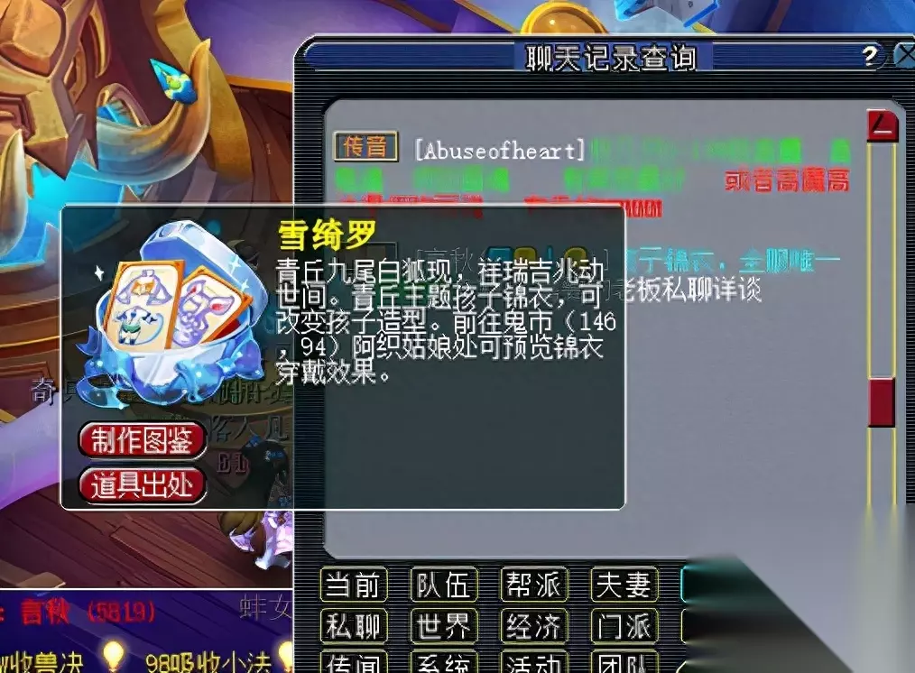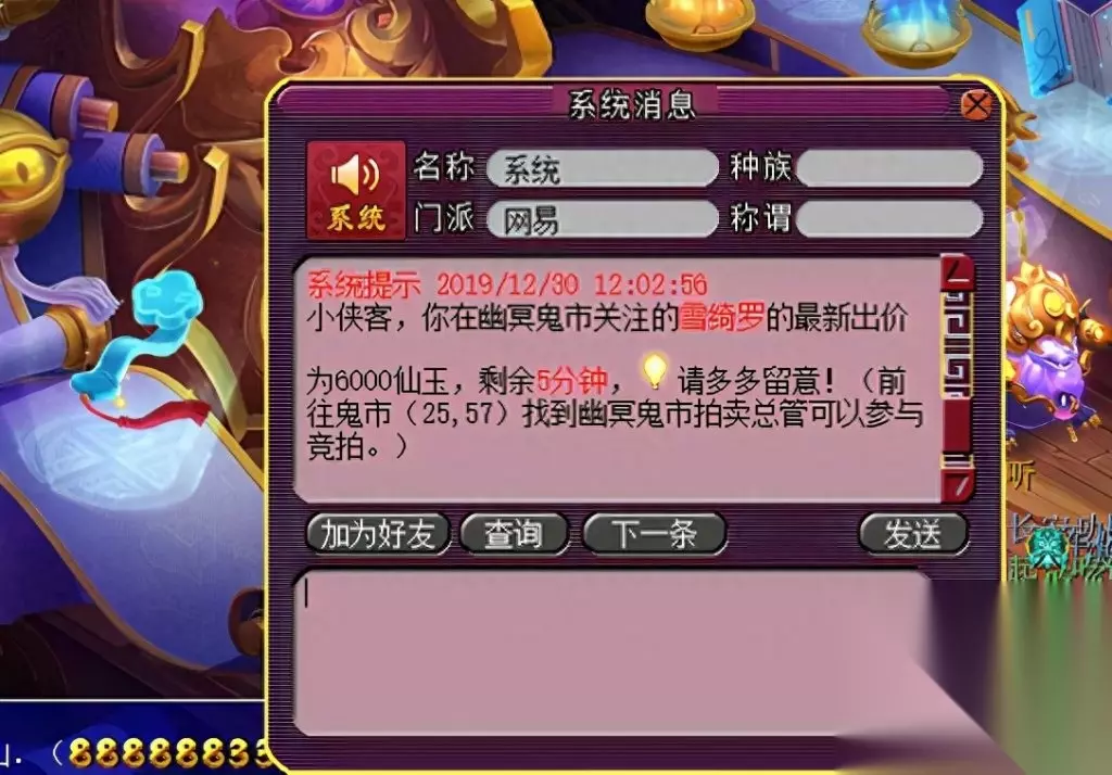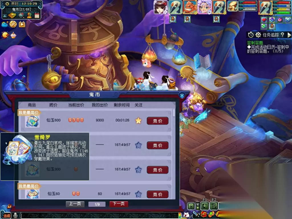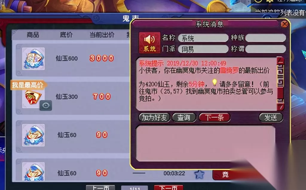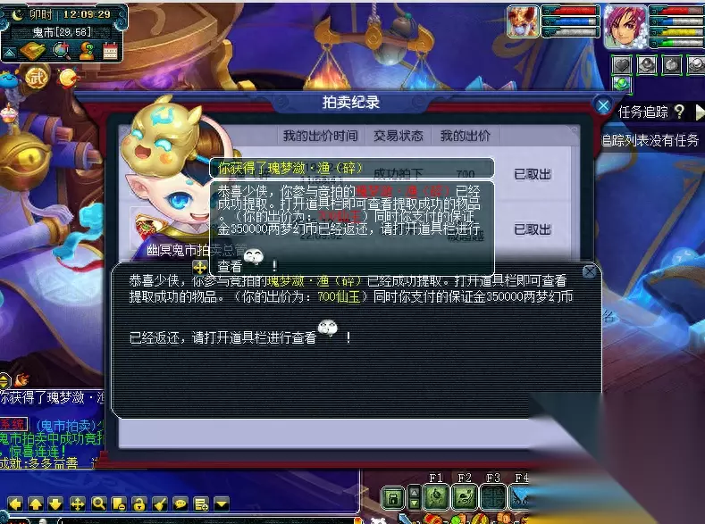特殊说明: 1、 若拍品拍卖结束前5分钟内无人加价,则拍卖周一12:00结束拍卖,结算胜出者。 2、 若拍品拍卖结束前5分钟内有人加价,则在有人出价时间的基础上顺延5分钟,循环往复直到5分钟内无人出价为止。 例:拍卖A道具,预定周一12:00结束拍卖,有玩家在周一11:58分出价,则拍品结束时间在11:58的基础上增加5分钟到12:03结束。若12:03分前无人出价,则结束拍卖结算胜出者。若期间依然有人出价,以此循环,以最新最后出价者的出价时间顺延5分钟结束拍卖。 关键提醒:所拍物品提前设置为关注,在每周一中午11:50分之前去鬼市(25,57)NPC处蹲点。所拍物品出价后在12:00前都无人超越你竞价,即可获得所拍物品。如果这个时间段有人参与竞拍,则在有人出价时间的基础上顺延5分钟,循环往复直到5分钟内无人出价为止。如果价格出的非常高,不妨试试超过10000仙玉竞拍还可以有成就呢。孩子锦衣可以通过拍大碎片和小碎片去合成获得。瑰梦潋·渔碎片只能通过鬼市竞拍和阿织的信物副本获得,在此需要注意的是,副本的答案都需要选1,否则会失败导致碎片消失。 瑰梦潋·渔副本攻略 拍卖结束,接下来让我们来看看竞争更加激烈的孩子锦衣-雪绮罗吧~ 看到这个9300,我不禁开始心疼起孙总,再花70块,不是又一点成就吗? 达到10000仙玉可获得1点成就点哦!如果想刷这个成就的小伙伴如果在临近的时候拍下,还是开个小号和自己竞猜吧!